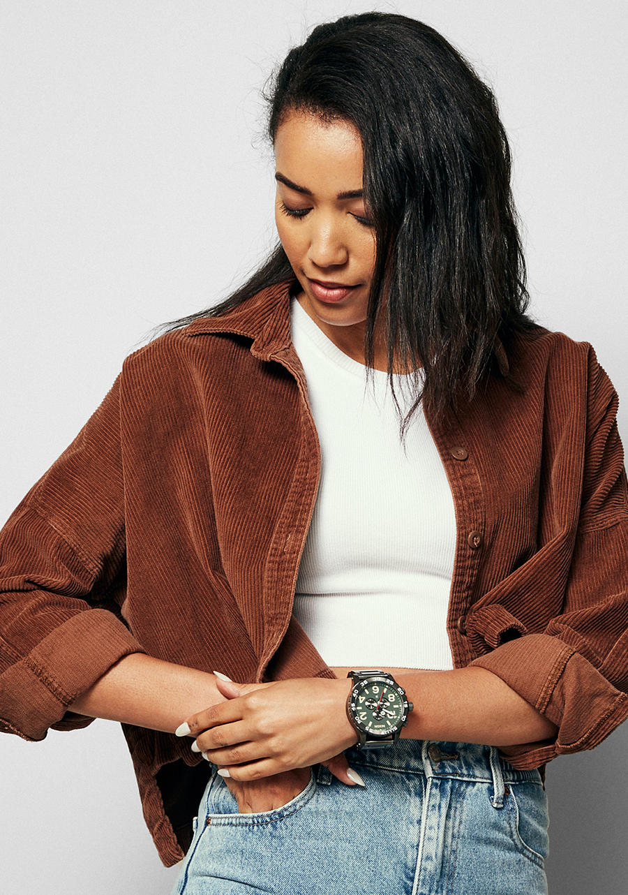 Le cadran est entouré d'un anneau concave et présente des index arabes et bâtons imprimés en gras, une piste des secondes imprimée, des sous-cadrans texturés en motif CD et des aiguilles moulées sur mesure.