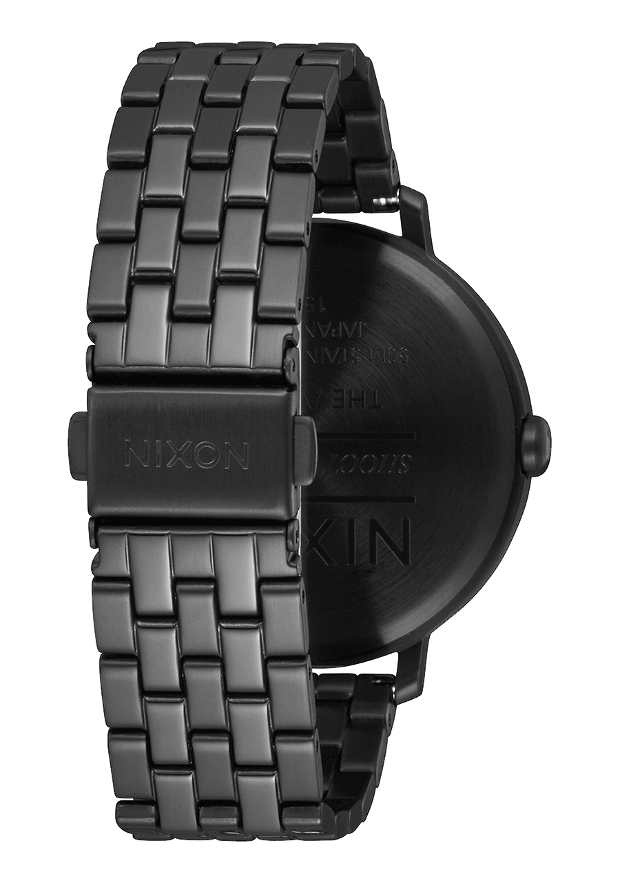 Les détails du cadran incluent le logo Nixon appliqué, les index des heures ainsi que les chiffres imprimés et les aiguilles moulées sur mesure.