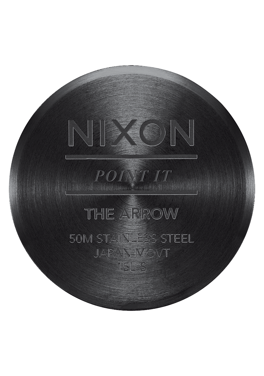 Le cadran présente le logo Nixon appliqué ainsi que des index horaires en chiffres arabes et en bâtons. Il comporte également des chiffres imprimés et des aiguilles moulées sur mesure.
