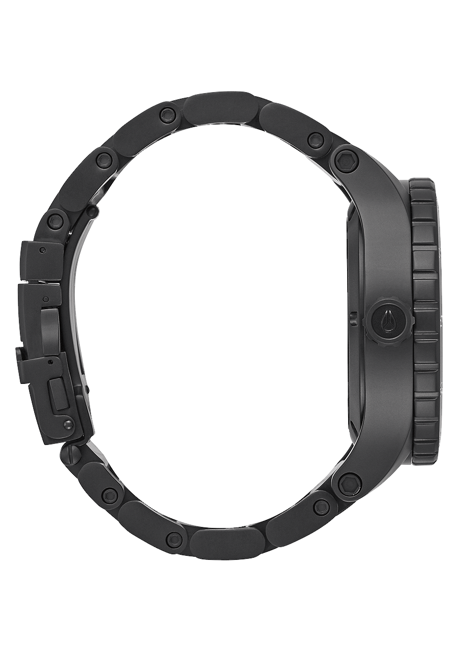 Boîtier personnalisé en acier inoxydable massif de 46 mm, étanche à 200 mètres/20 ATM, avec lunette tournante unidirectionnelle en acier inoxydable. Insert de lunette en acier inoxydable plaqué IP avec marquages du compte à rebours remplis de couleur. Verre saphir bombé avec traitement antireflet sur la face inférieure. Couronne vissée en acier inoxydable à triple joint à 3 heures. Fond de boîtier vissé en acier inoxydable avec verre d'exposition montrant le rotor du mouvement gravé sur mesure. Barres de fixation à vis hexagonale de 2 mm en acier inoxydable. Numéro de série individuel gravé sur le fond de boîtier.