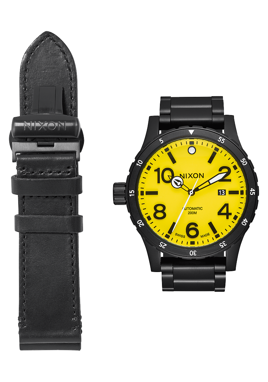 Bracelet personnalisé en acier inoxydable massif de 23 mm à 3 maillons avec des goupilles à vis hexagonales de 1,5 mm. Permet un réglage rapide et sans outil du bracelet de 10 mm en temps réel. Fermoir à double verrouillage. Bracelet alternatif en Horween Aniline Chromexcel noir avec boucle déployante brossée en acier inoxydable.