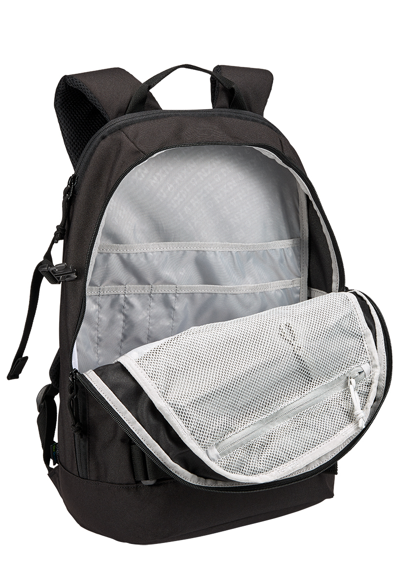 Grand compartiment principal avec poches internes d’organisation. Housse pour ordinateur portable (15") avec accès par fermeture éclair externe. Sangles externes pour skateboard, poche pour bouteille d’eau, poche fourre-tout zippée et boucle multifonction. Petite poche amovible en maille attachée à la bandoulière, taille idéale pour un petit flacon de désinfectant pour les mains.