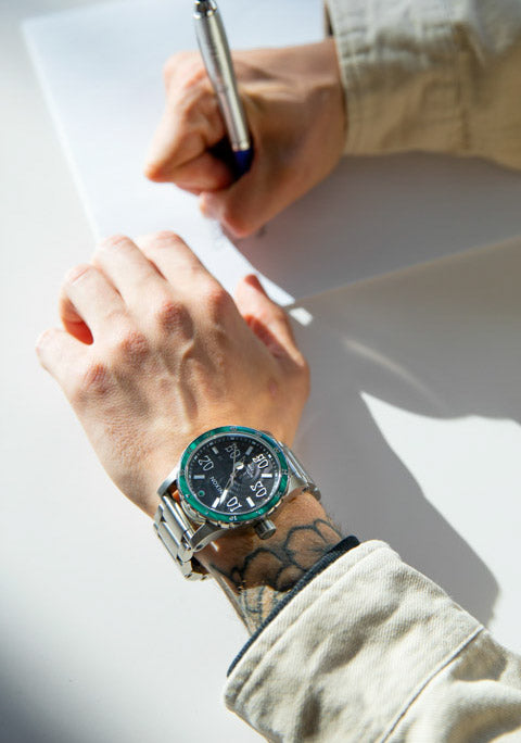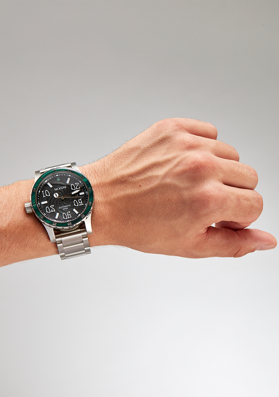 Mouvement automatique japonais Miyota 8215, aiguille des secondes fluide et rotor de mouvement gravé sur mesure soulignent quelques-unes des touches raffinées du Diplomatic. Ils mettent également en avant des chiffres et index appliqués sur le cadran et la lunette, avec une échelle des secondes imprimée sur la lunette tournante unidirectionnelle. Précision de niveau professionnel avec une étanchéité de 200 m / 20 ATM pour en attester.