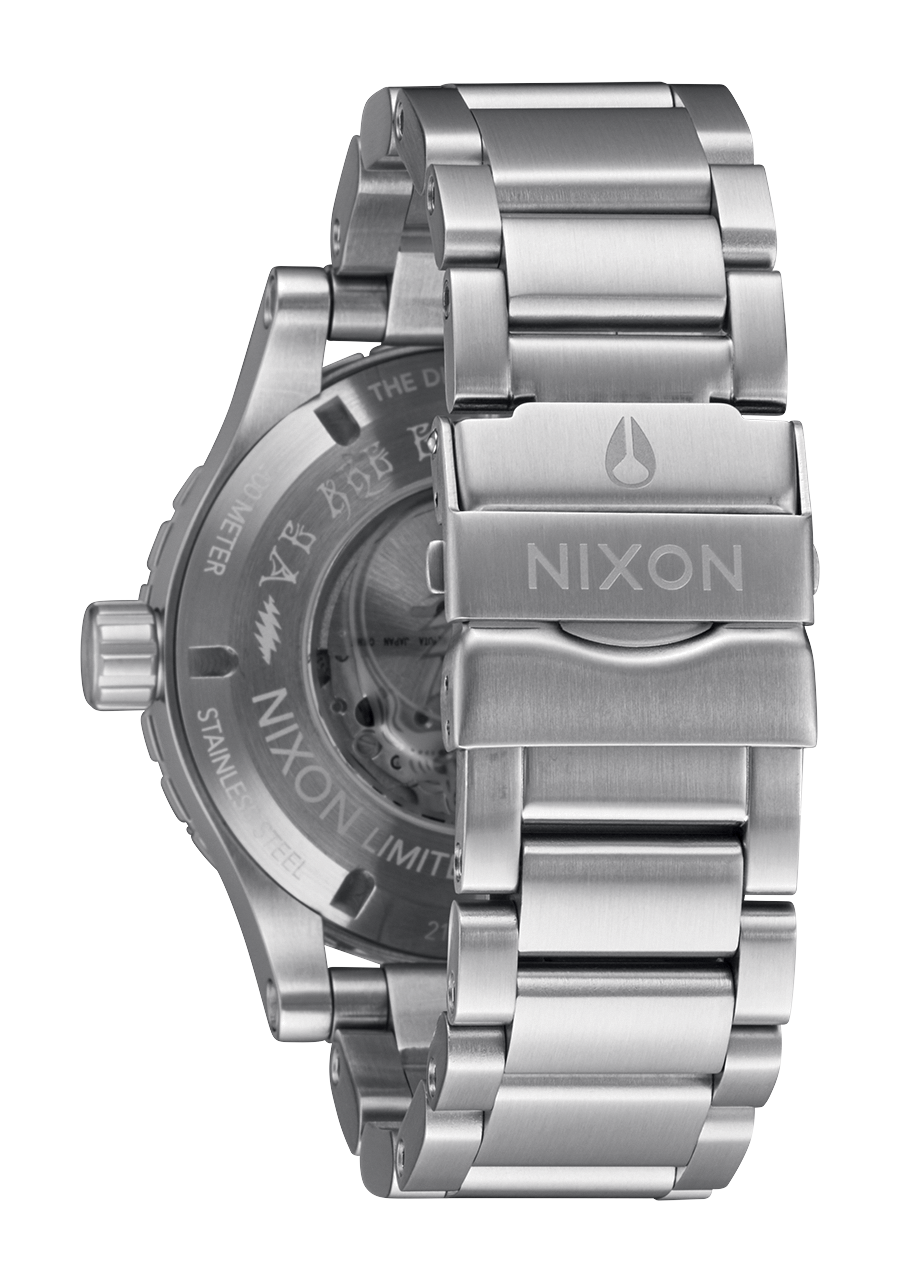 Boîtier personnalisé en acier inoxydable massif de 46 mm, étanche à 200 mètres/20 ATM, avec lunette tournante unidirectionnelle en acier inoxydable. Insert de lunette en acétate avec marquages de minuterie dégressive en acier inoxydable. Verre saphir bombé avec traitement antireflet sur la face inférieure. Couronne vissée en acier inoxydable à triple joint à 9 heures. Fond de boîtier vissé en acier inoxydable avec verre d'exposition et motif gravé personnalisé montrant le rotor du mouvement gravé sur mesure. Barres de fixation à vis hexagonale de 2 mm en acier inoxydable. Numéro de série individuel gravé sur le fond de boîtier.