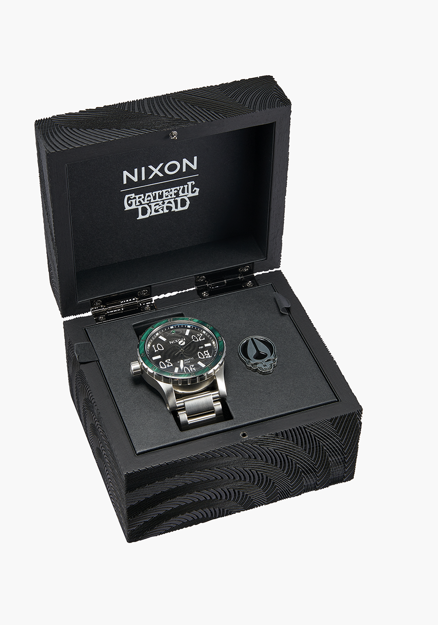 Détails Grateful Dead de l'incrustation en acétate autour de la lunette assortie au marqueur en pierre de malachite à 12 heures, jusqu'à l'aiguille des secondes en forme d'éclair moulée sur mesure à 13 pointes ainsi que gravée sur la couronne. Le mouvement automatique est visible à travers le fond de boîte en verre saphir présentant le crâne Steal Your Face et un message spécial Dead Head autour du bord. Pour couronner le tout, une épingle émaillée souvenir accompagne ce coffret premium.