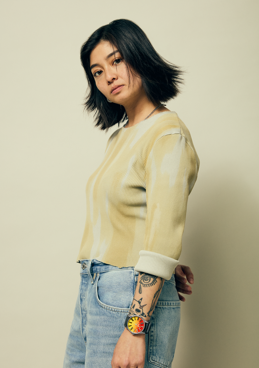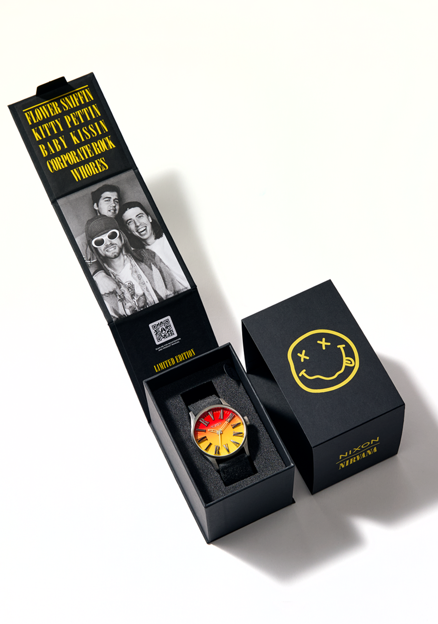 Les lignes de texte classiques de Nirvana ornent le cadran et servent d'indices sur un dégradé allant du rouge au jaune. Le bracelet en cuir unique s'inspire des choix de pulls emblématiques du groupe.