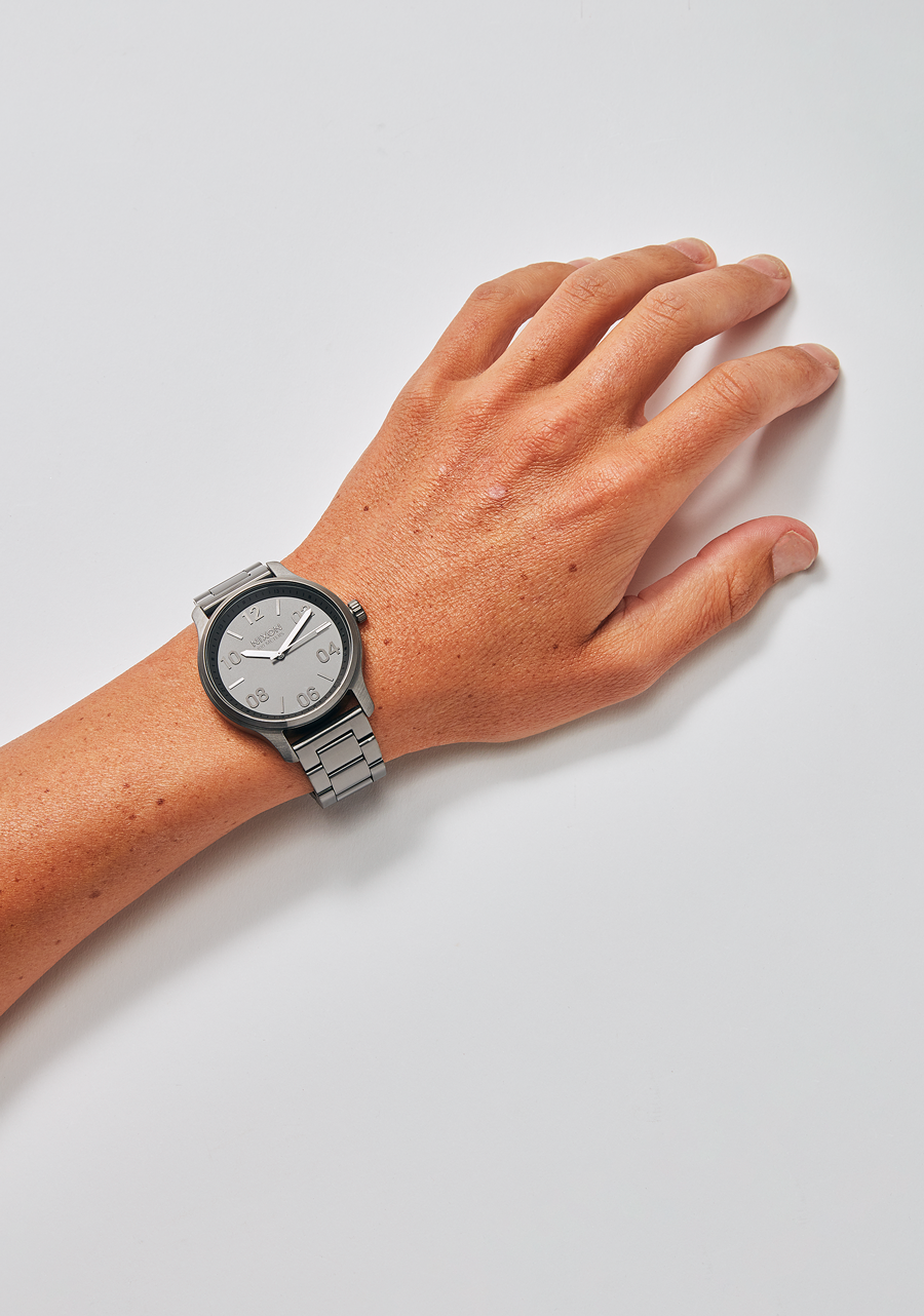 Boîtier personnalisé en acier inoxydable massif de 42 mm avec une étanchéité de 100 mètres / 10 ATM. Équipé d'un verre minéral durci, d'un fond de boîtier vissé en acier inoxydable et de cornes à goupilles ressort.