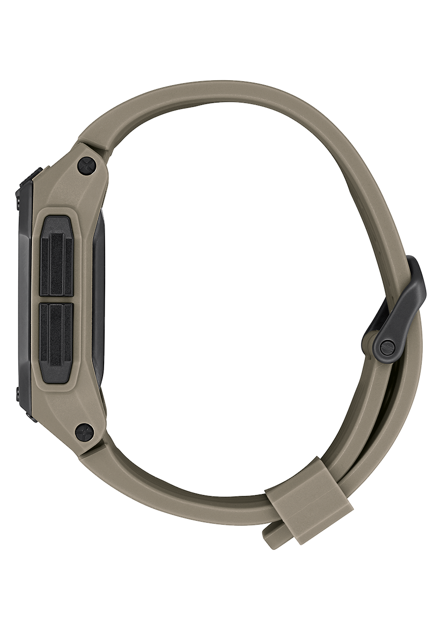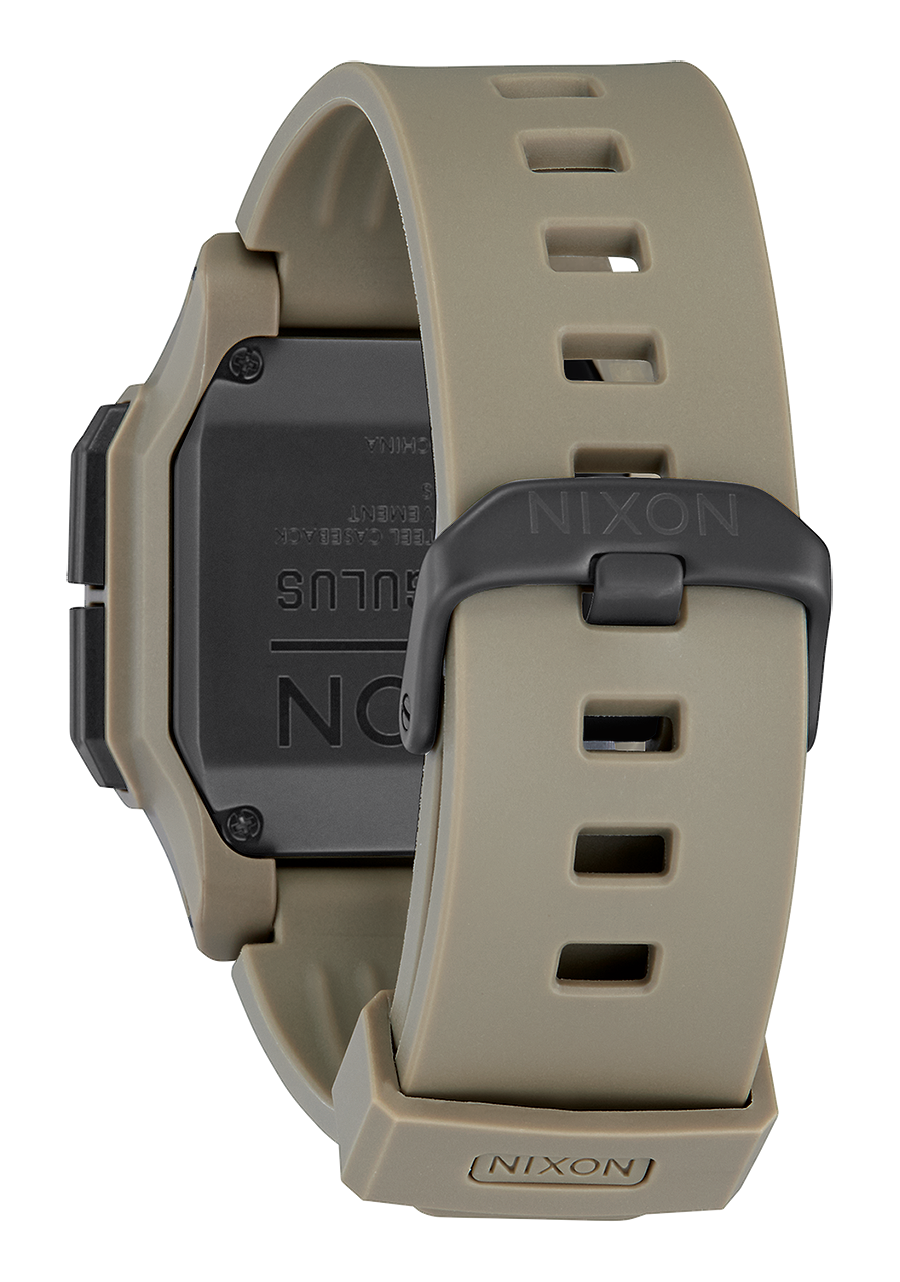 La Nixon Regulus est une montre très résistante avec une résistance à l'eau et aux chocs. Nous avons utilisé de la mousse Poron entre le cerveau de la montre et le boîtier, qui agit comme une coque anti-chocs. La montre est enfermée dans une coque en PU protectrice et comprend un rembourrage en mousse Poron pour une absorption des chocs et une durabilité accrues. La Regulus possède également un bracelet en caoutchouc moulé robuste et une boucle en acier inoxydable, renforçant sa robustesse et sa durabilité.