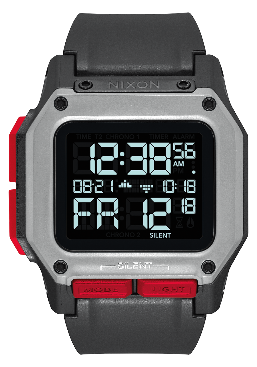 La Nixon Regulus est équipée de deux chronographes, de trois alarmes indépendantes, d'un mode silencieux, d'un rétroéclairage LED réglable, et est résistante à l'eau.