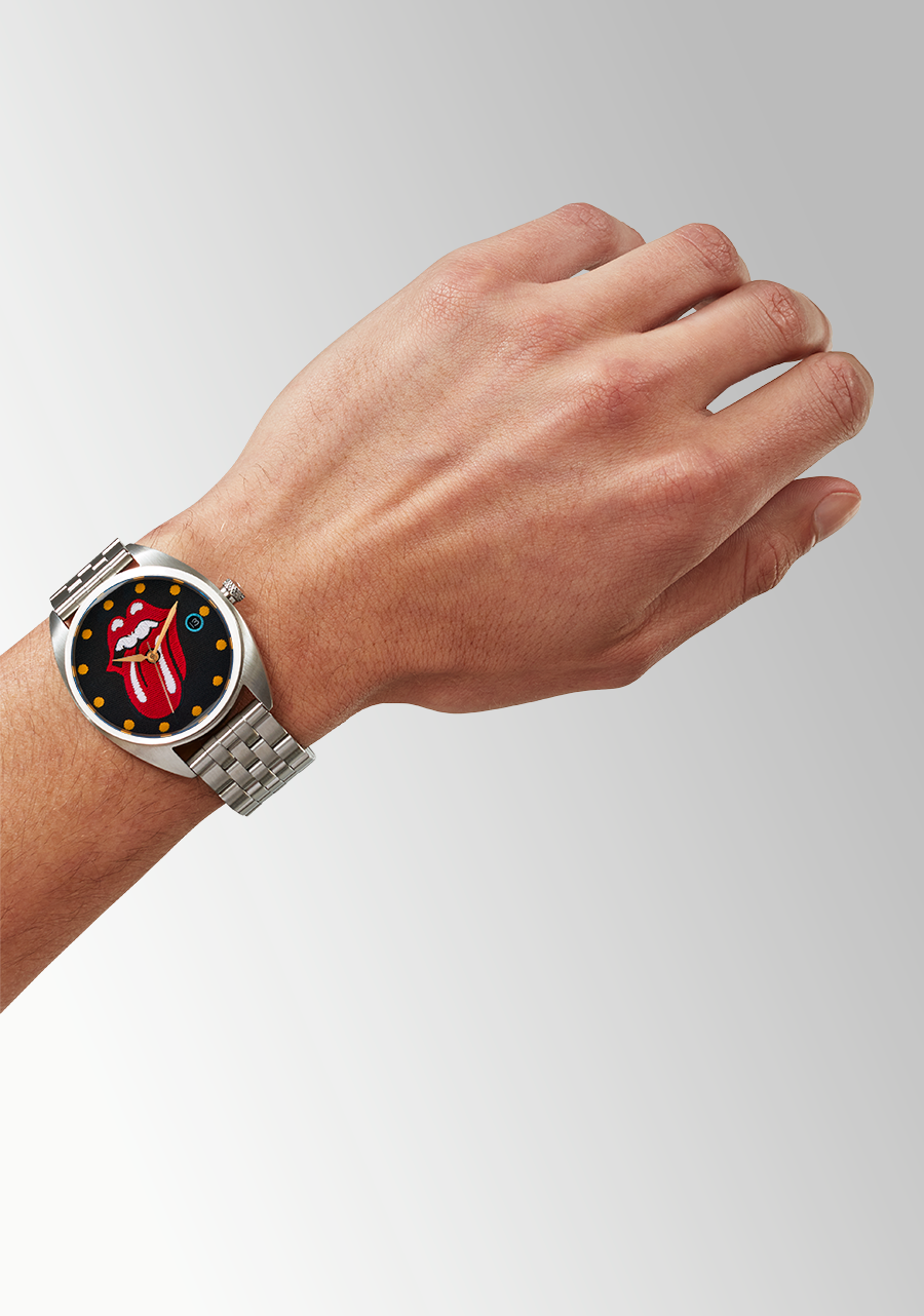 Le cadran présente des index appliqués et des aiguilles moulées sur mesure. Il arbore la langue classique des Rolling Stones, des index orbitaux dorés et une fenêtre de date soulignée en bleu.