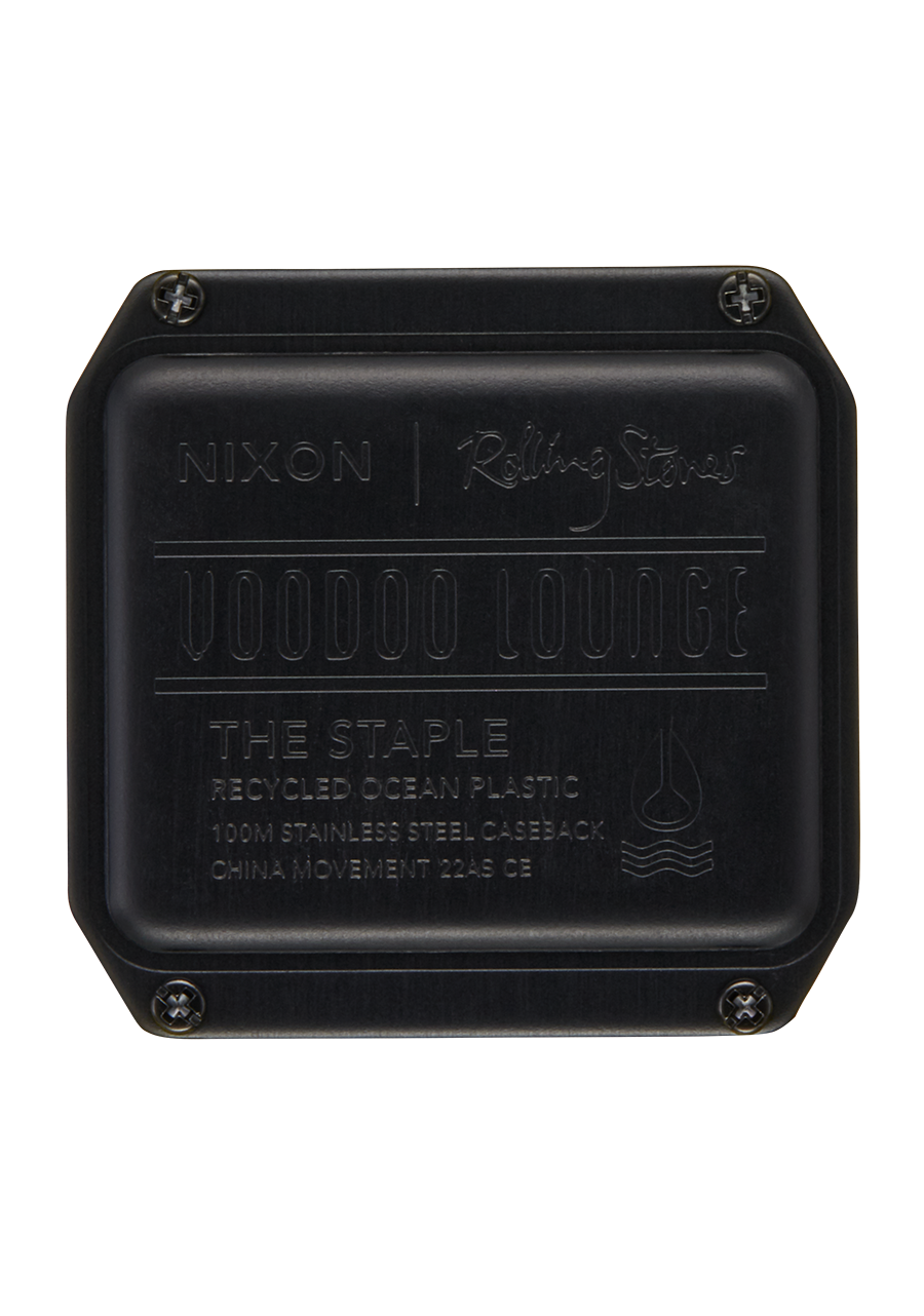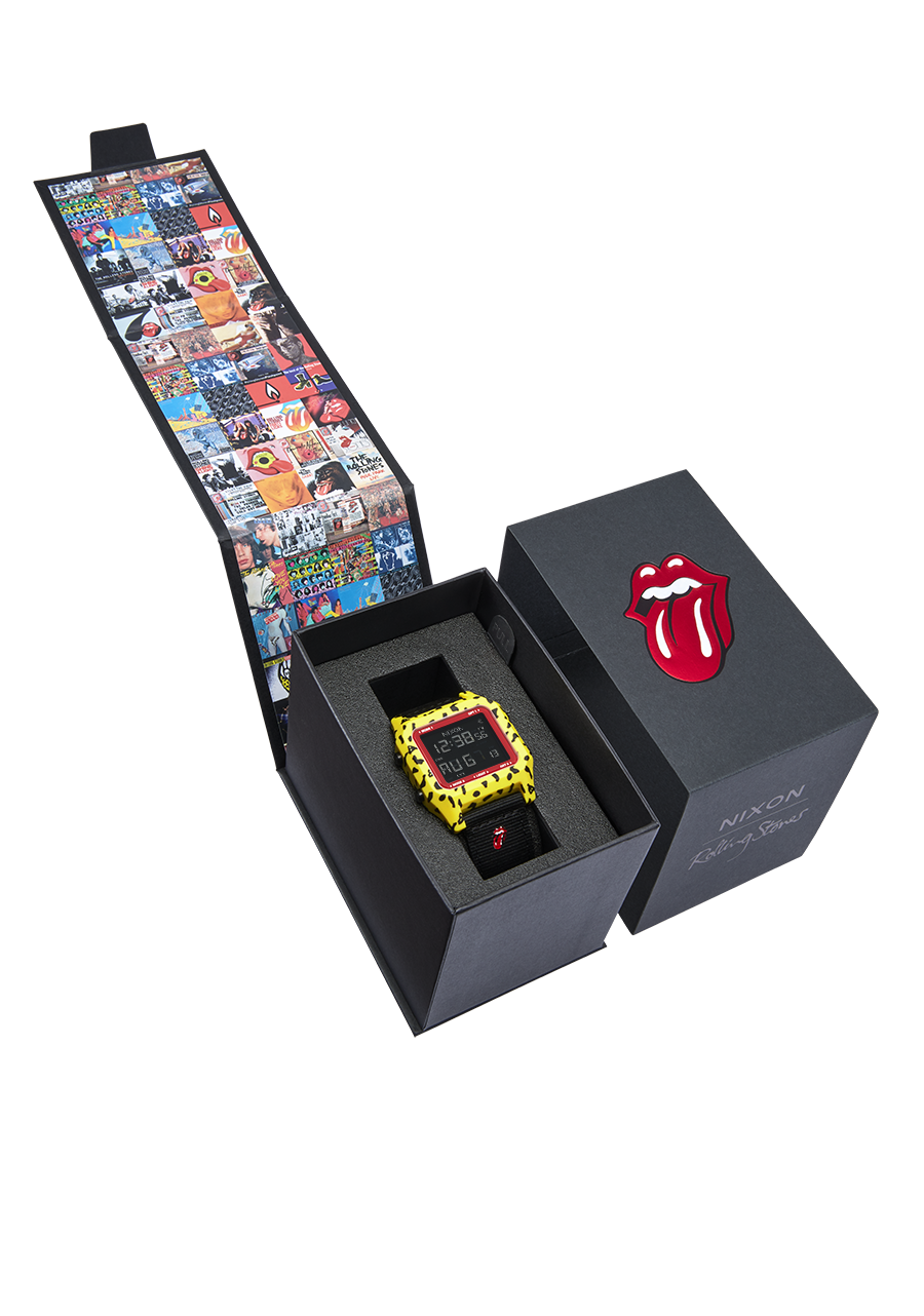 Un boîtier voodoo jaune inspiré par la pochette de l'album des Stones, tandis que les logos Nixon et Stones ornent le bracelet axé sur la performance. Les fonctions incluent l'heure, le jour/date avec calendrier automatique jusqu'en 2099, chronographe avec résolution au 1/100 de seconde, minuterie, alarme et rétroéclairage EL. La disposition de l'affichage permet d'afficher simultanément deux fonctions.