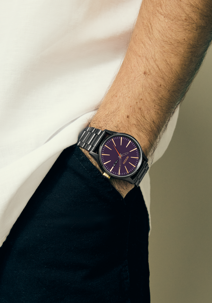This collection elevates the traditional silver pairing by combining classic gold accents with a bold gunmetal case and stainless steel band. Then it cranks the dial all the way up with a deep and polarizing blackberry or lavender finish. It may be obvious already, but these watches are loud, respectfully.