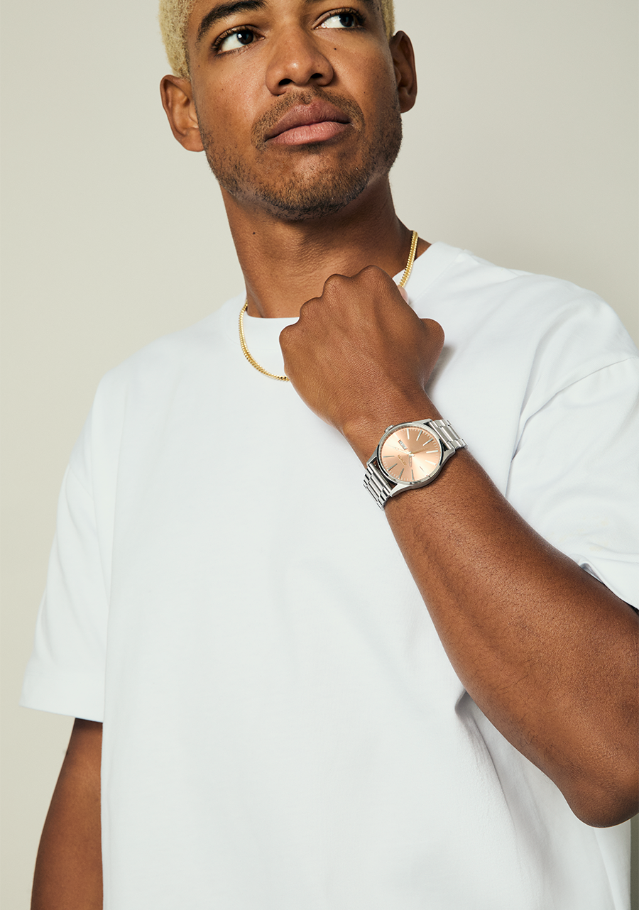 La Sentry est une montre élégante avec un côté aventurier. Imaginez un smoking rencontrant une fête de quartier. Le cadran se distingue par sa profondeur et ses détails, mais avec son boîtier en acier inoxydable massif, son verre minéral renforcé et son étanchéité jusqu'à 100 m, vous n'avez pas à craindre qu'elle ne tienne pas dans le monde réel.