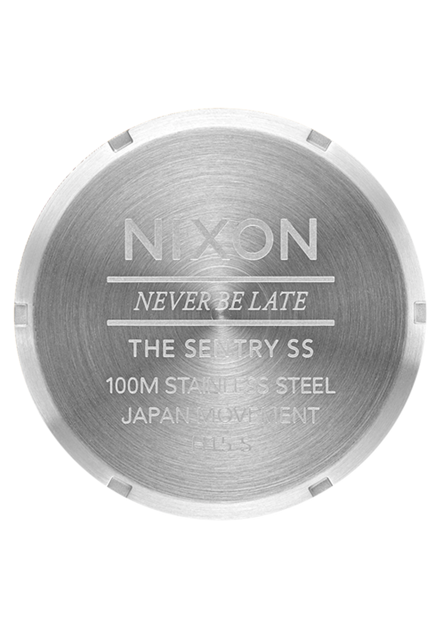 La montre Nixon Sentry en acier inoxydable utilise un mouvement à quartz japonais Miyota 2305 à 3 aiguilles et dispose d'une fonction bilingue jour et date en anglais et en espagnol.