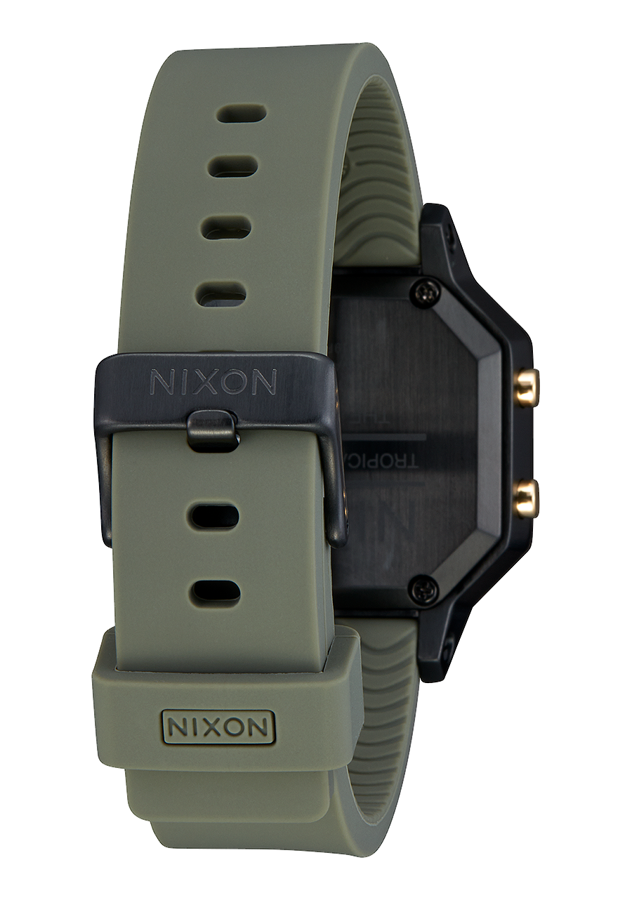 La Nixon Siren en acier inoxydable utilise un boîtier en acier inoxydable personnalisé avec des barres de fixation et des poussoirs en acier inoxydable, et un bracelet en silicone ultra-doux moulé par injection avec une boucle en acier inoxydable solide et des barres de fixation. La montre est résistante à l'eau jusqu'à 100 mètres / 10 ATM, ce qui la rend très durable pour l'eau et les sports.