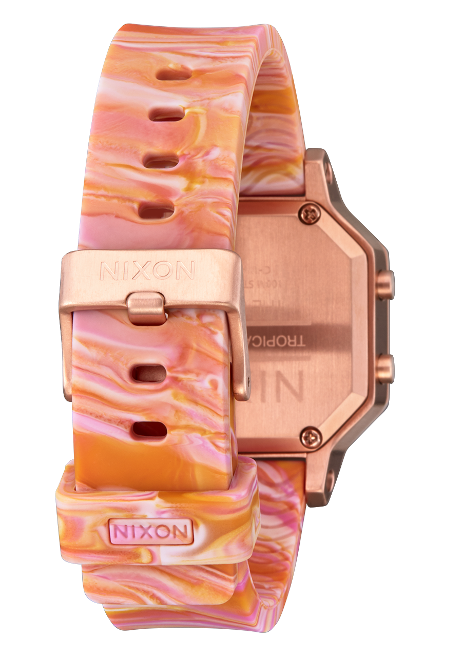 Bracelet de montre en silicone ultra-doux moulé par injection sur mesure, conique de 18 à 16 mm, avec un passant verrouillable breveté. Comprend également une boucle en acier inoxydable massif et une connexion par barre à vis.