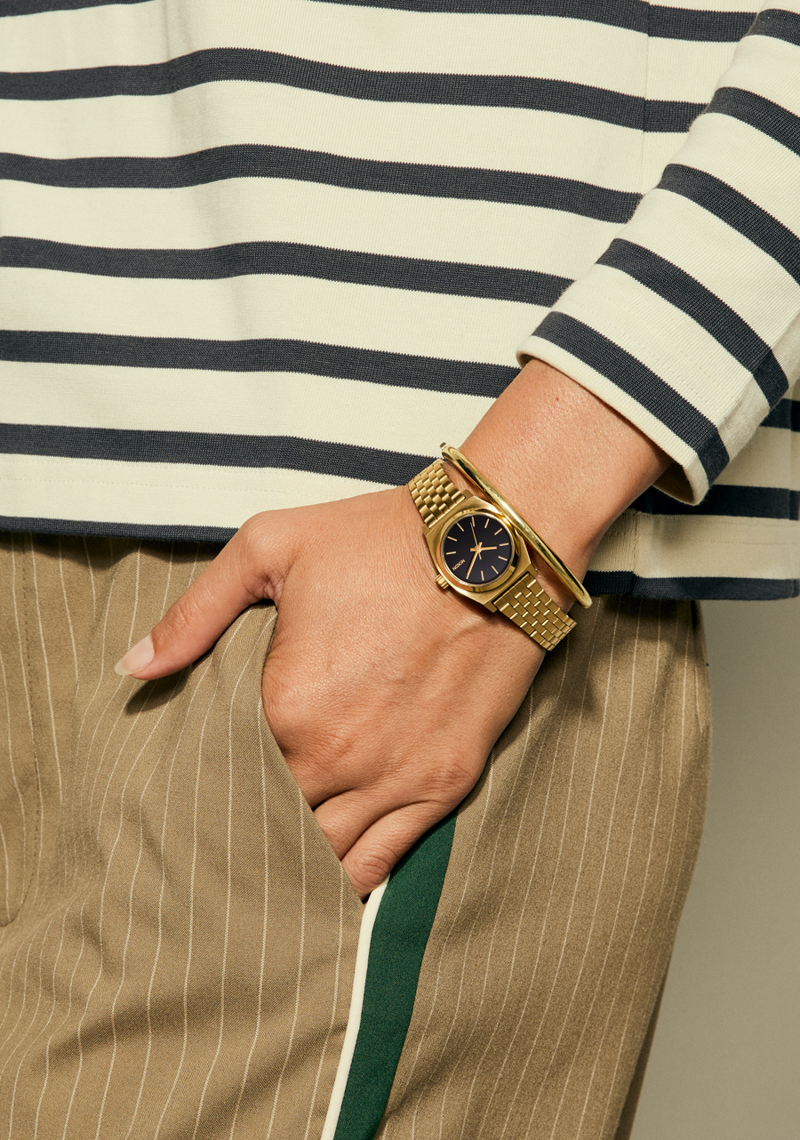La Small Time Teller dispose d'un boîtier de 26 mm et d'un bracelet de style bijou personnalisé avec une boucle à double verrouillage conçue pour s'adapter en toute sécurité à une gamme de tailles de poignet, y compris les poignets plus petits.