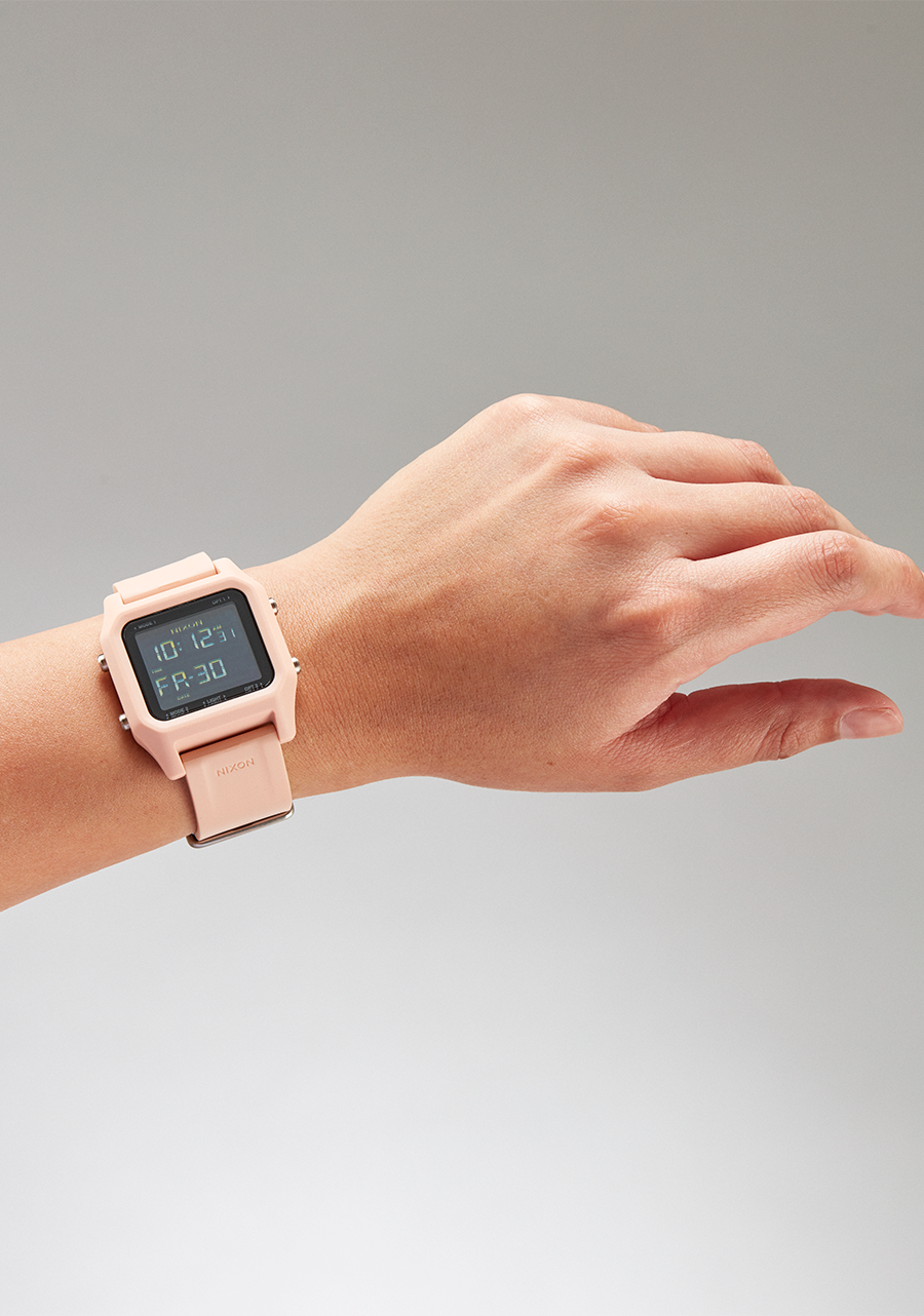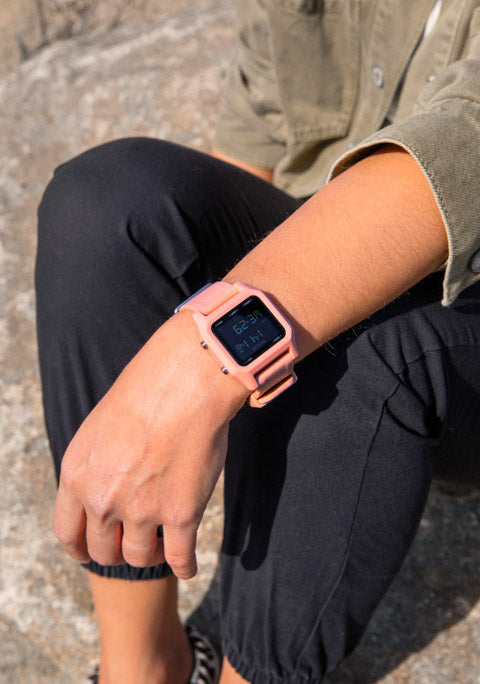 Boîtier de 39 mm en plastique recyclé des océans renforcé de fibres, moulé par injection personnalisée, avec une étanchéité de 100 mètres / 10 ATM. Équipé de poussoirs en acier inoxydable, d'un verre minéral durci, d'un fond de boîtier vissé en acier inoxydable massif et de cornes à goupilles vissées.