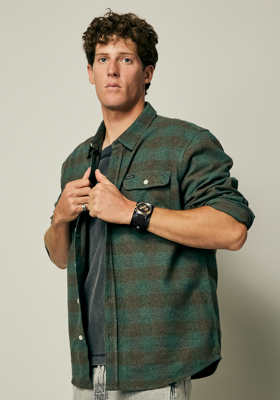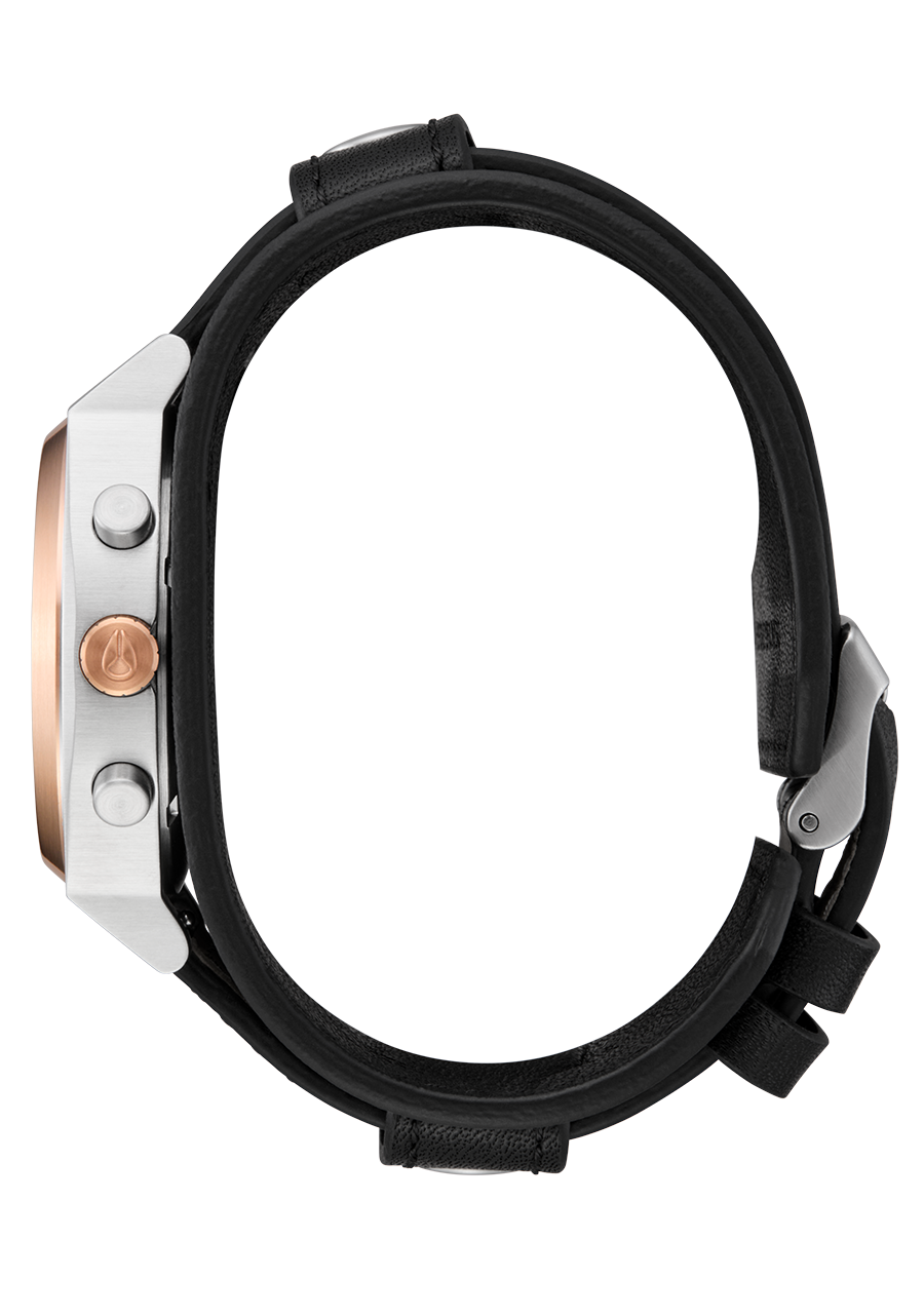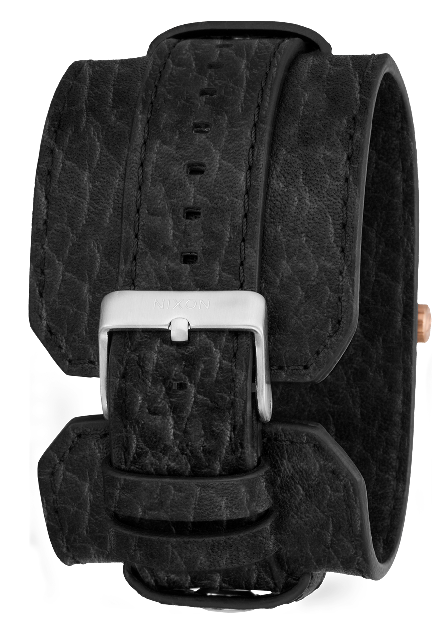 Bracelet de montre en cuir véritable de 20 mm à dégagement rapide avec boucle en acier inoxydable massif. Bracelet rocker personnalisé en cuir véritable de 45 mm avec logo Nixon et rivets en acier inoxydable. Les bracelets peuvent être séparés pour créer deux looks différents.