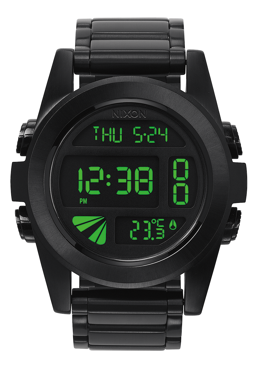 Mouvement numérique personnalisé avec affichage négatif, heure au format 12 ou 24 heures, calendrier, indicateur de température, double fuseau horaire, minuterie de compte à rebours, chronographe, alarme et fonctions d'éclairage.